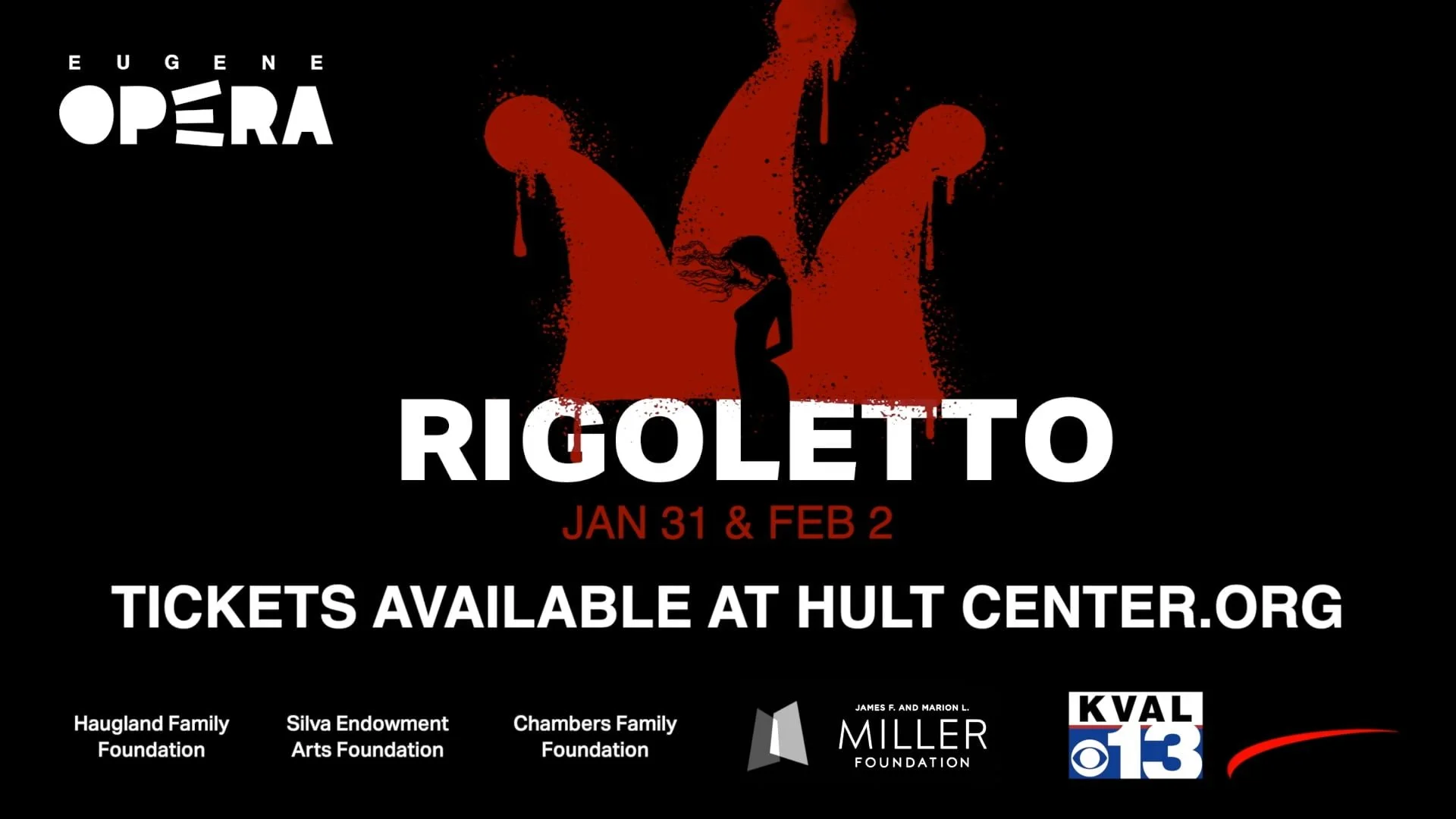 A bold design featuring a striking jester, symbolizing  Rigoletto’s  central character. Crimson evokes passion and turmoil, with the tagline "LOVE. POWER. REVENGE." Performance dates and ticket details are prominently displayed alongside the Eugene